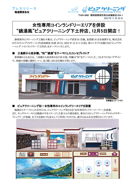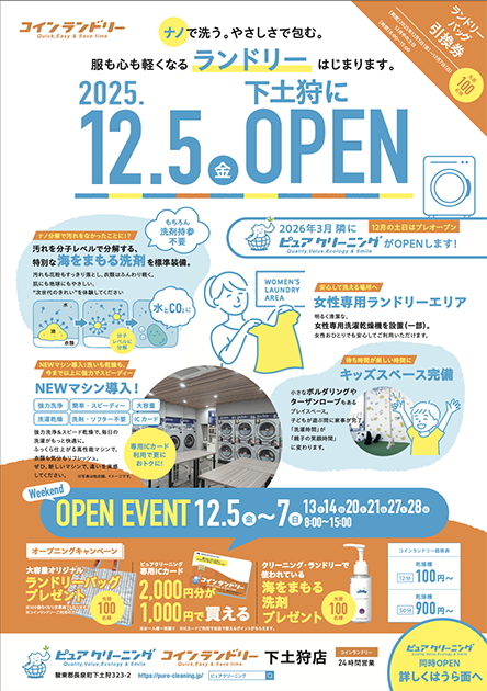 2025年12月5日(金)、新コンセプト店舗となる「ピュアクリーニング下土狩店」「コインランドリー下土狩店」をオープンいたします。