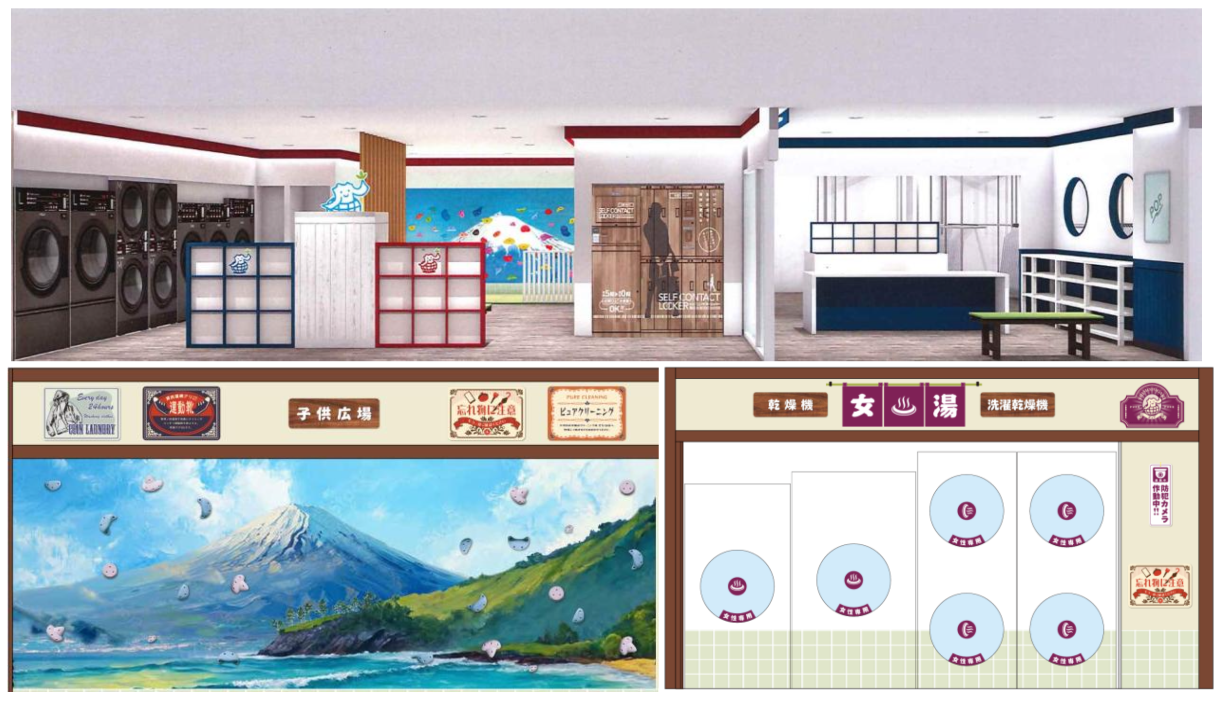 銭湯をモチーフにした店内には、ピュアクリーニング初となる「女性専用ランドリーコーナー」を設置。また、キッズスペースには銭湯の中をイメージした富士山の絵を描き、番台にはピュアクリーニングのキャラクター「ピュアリ-」が登場。お子さま連れでも安心してご利用いただける、遊び心あふれる空間となっています。
