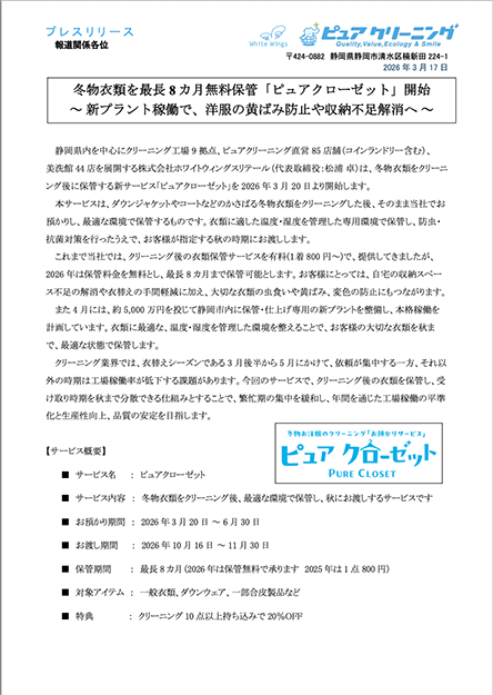 静岡新聞_ピュアクリーニング 冬物衣類を長期間無料保管サービス