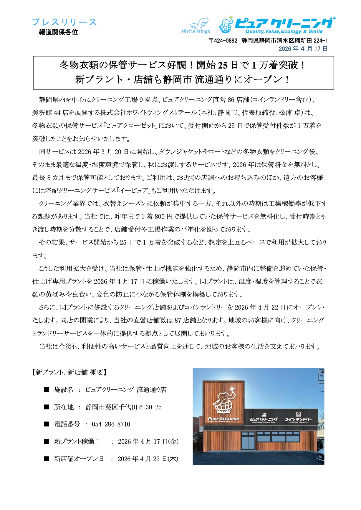 【ホワイトウィングス プレスリリース】「ピュアクローゼット1万着突破」(20260417)